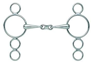 The French link in this bit means pressure is applied to both sides of the tongue. Some horses with low palates may find this bit more comfortable as the mouthpiece should not come into contact with the palate when the bit is in action. The three rings offer leverage options to increase severity. Mouthpiece thickness: 16mm. Cheek height: 150mm (4.5″, 5″), 180mm (5.5”).
