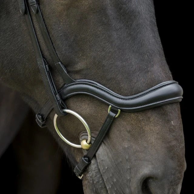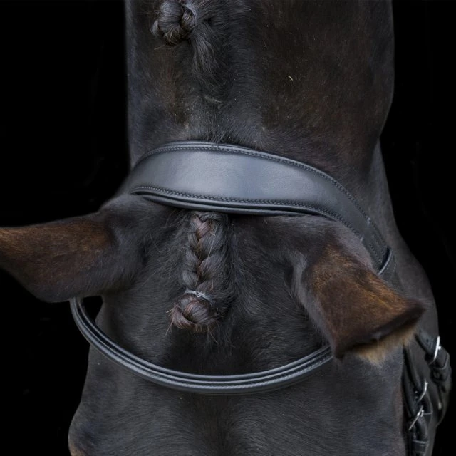 Using the softest and most supple eco leather we have created a balanced and elegant anatomic bridle. From the the soft padding on a dipped anatomic noseband to the padded and shaped headpiece and browband this bridle exudes luxurious comfort. The noseband is designed to fit gently below the sentive cheekbone yet retain control with the positioned flash strap that sits in a free position to stop the pinching that can occur in more traditional flashes. The bridle is finished with a soft padded and raised browband. A truley graceful and effective anatomic bridle.