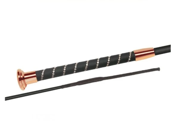 A stylish Dressage whip is designed with a fibreglass shaft and finished with a silk touch, eye catching crystal wrapped handle. A very elegant and comfortable whip. NEW Rose Gold colour available!!