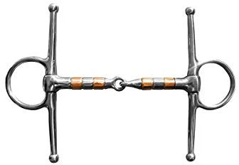The Full cheek copper roller snaffle is a popular bit, and is used for horses that need something stronger than a jointed bit because they lean or try to grab the bit. The alternating stainless steel and copper rollers set along the mouthpiece, allow the bit to roll up the mouth, and help to prevent the horses from grabbing it between the teeth. The jointed mouthpiece gives a nutcracker action on the bars, and can contact the palate. Full cheek bits are often used on young horses to aid steering, as the cheek gives a more positive action against the cheek when the rider asks for a turn. Full cheek snaffles should be used with fulmer loops which secure the top of the bit to the cheekpieces to prevent the bit from rotating and leaving the cheeks pointing out which could pose a hazard. By securing the cheek, it also allows a very small amount of poll pressure to come into play, helping to encourage a lower outline.
