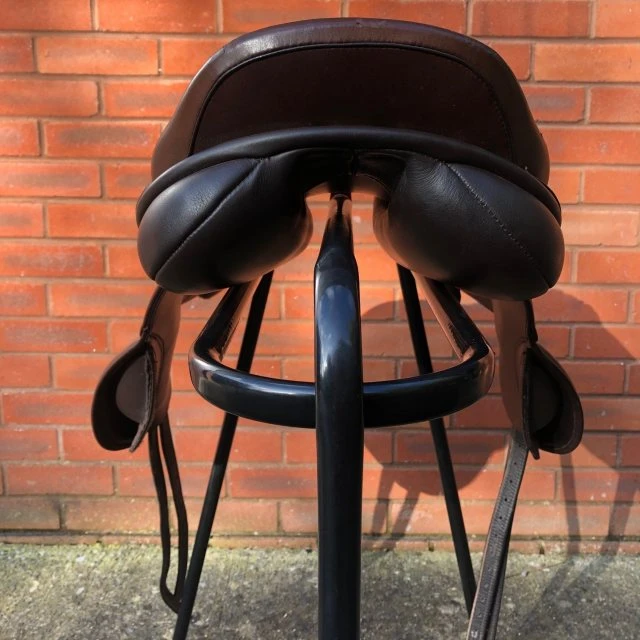A 17″ Medium wide close contact jump saddle, in Havana, made by Ideal.