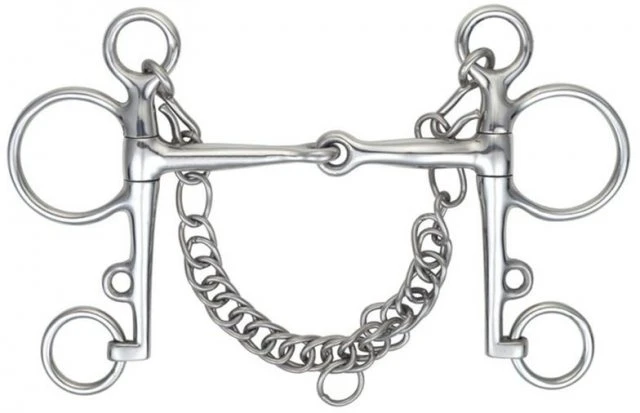 The Pelham is a bit that provides additional lever action on the poll. Pressure is applied to the lower jaw bones by the use of a curb chain. In a way the Pelham is a combination of a Weymouth and a bradoon. Pelhams can be used with one or two reins, which enables different rein options. Direct pressure is applied to the horses tongue and bars if the rider only uses the snaffle rein.