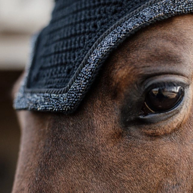 With a longer panel at the back and slim-fitting ears these features will help the fly veil to stay in place; quality hand-knitted and completed with a trim of gorgeous crystals to help you sparkle in the competition ring.