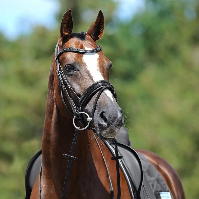 The patent leather Apollo Snaffle Bridle ensures a stunningly glamorous look! The Caveson Special with softly lined noseband with shiny patent leather trim convinces at first sight. The head piece has an extra-soft lining, and the head strap of the noseband is firmly attached to the head piece of the snaffle bridle which effectively reduces pressure on the horse’s poll. Matching the patent leather noseband, the Apollo Snaffle Bridle has a waved browband with large Premium Crystals in Graphite, adding a dark and mysterious shine. A beautiful and stunning eye-catcher!