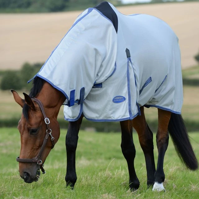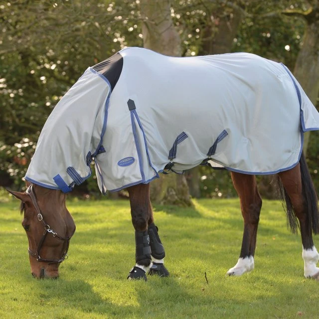 Soft, durable polyester mesh with NEW Ultra belly wrap and full wrap tail flap for premium protection and elastic insert at wither for additional comfort when grazing. Ezi-Clip front closure, traditional side gusset for natural movement, 210T nylon lined shoulders, mane and tail flap and elasticated, adjustable and removeble leg straps.