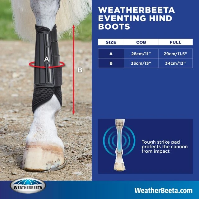 The WeatherBeeta Eventing Hind Boots are so easy to care for, with a waterproof outer and strong durable and secure double touch tape closures. The micro perforated neoprene breathable lining does not carry water, which means the boot is kept continuously lightweight. It features a tough and flexible strike pad for added protection against knocks and brushes.